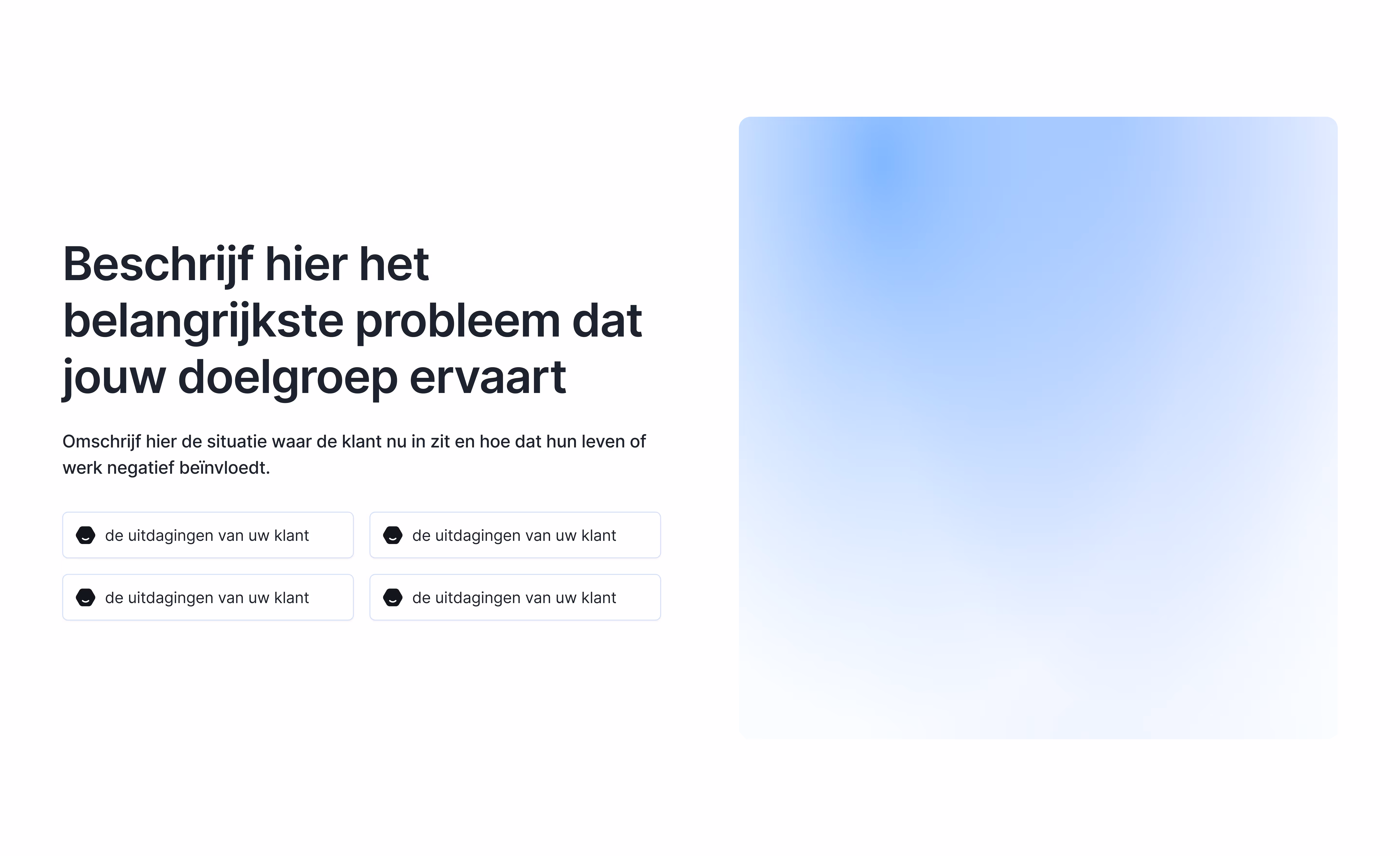 {"type":"@webflow/XscpData","payload":{"nodes":[{"_id":"86877a8e-8336-c291-6d85-f14d3365d714","type":"Block","tag":"section","classes":["2e7df772-5641-bc11-7c2f-775be5360f11"],"children":["90c5a694-d3e5-1a99-61d1-7afa84c76827"],"data":{"text":false,"tag":"section","devlink":{"runtimeProps":{},"slot":""},"displayName":"","attr":{"id":""},"xattr":[],"search":{"exclude":false},"visibility":{"conditions":[]}}},{"_id":"90c5a694-d3e5-1a99-61d1-7afa84c76827","type":"Block","tag":"div","classes":["62366dc3-2432-a5d1-67e0-085e73aa474a"],"children":["91cada4a-1b91-6f19-2638-4ef958302471"],"data":{"text":false,"tag":"div","devlink":{"runtimeProps":{},"slot":""},"displayName":"","attr":{"id":""},"xattr":[],"search":{"exclude":false},"visibility":{"conditions":[]}}},{"_id":"91cada4a-1b91-6f19-2638-4ef958302471","type":"Block","tag":"div","classes":["b0934d9a-875a-bb42-0630-12090a77fc5b"],"children":["9cf3f661-d1dc-991b-1990-15eb0cbeac49"],"data":{"text":false,"tag":"div","devlink":{"runtimeProps":{},"slot":""},"displayName":"","attr":{"id":""},"xattr":[],"search":{"exclude":false},"visibility":{"conditions":[]}}},{"_id":"9cf3f661-d1dc-991b-1990-15eb0cbeac49","type":"Block","tag":"div","classes":["47e53913-eb45-d5ea-b09a-1fceda151969"],"children":["1ae0e533-6185-950c-c0c5-bd1d214a6c03"],"data":{"text":false,"tag":"div","devlink":{"runtimeProps":{},"slot":""},"displayName":"","attr":{"id":""},"xattr":[],"search":{"exclude":false},"visibility":{"conditions":[]}}},{"_id":"1ae0e533-6185-950c-c0c5-bd1d214a6c03","type":"Block","tag":"div","classes":["2e7df772-5641-bc11-7c2f-775be5360f12"],"children":["19348698-227e-35de-2232-d3bfbed8bffc"],"data":{"text":false,"tag":"div","devlink":{"runtimeProps":{},"slot":""},"displayName":"","attr":{"id":""},"xattr":[],"search":{"exclude":false},"visibility":{"conditions":[]}}},{"_id":"19348698-227e-35de-2232-d3bfbed8bffc","type":"Grid","tag":"div","classes":["2e7df772-5641-bc11-7c2f-775be5360f15"],"children":["6988759c-1ba3-da7b-31b8-83e5adc88e7d","3696f58c-d105-3c3c-9865-50e7ab89798e"],"data":{"devlink":{"runtimeProps":{},"slot":""},"displayName":"","attr":{"id":""},"xattr":[],"search":{"exclude":false},"visibility":{"conditions":[]},"grid":"two-by-two","tag":"div"}},{"_id":"6988759c-1ba3-da7b-31b8-83e5adc88e7d","type":"Block","tag":"div","classes":["2e7df772-5641-bc11-7c2f-775be5360f16"],"children":["5b47d9bf-5a0d-6898-a966-2a4bfbd4ce9e","658f0251-88ff-186f-c45e-5dce1acf43e0","2c3d2e2b-8e90-2512-ec01-97b0477ae94d","7738c5d1-acde-d624-c5e8-855c408f79f8"],"data":{"text":false,"tag":"div","devlink":{"runtimeProps":{},"slot":""},"displayName":"","attr":{"id":""},"xattr":[],"search":{"exclude":false},"visibility":{"conditions":[]}}},{"_id":"5b47d9bf-5a0d-6898-a966-2a4bfbd4ce9e","type":"Block","tag":"div","classes":["2b7ce42a-68c2-b493-7ffe-3975868fa804","2adac28d-b1cd-2814-fd2f-d06e92612f51"],"children":["c6c54ebd-e617-af8a-b562-b543ade15a95"],"data":{"text":false,"tag":"div","devlink":{"runtimeProps":{},"slot":""},"displayName":"","attr":{"id":""},"xattr":[],"search":{"exclude":false},"visibility":{"conditions":[]}}},{"_id":"c6c54ebd-e617-af8a-b562-b543ade15a95","type":"Heading","tag":"h2","classes":["2e7df772-5641-bc11-7c2f-775be5360f13"],"children":["d7f9bcb5-8196-3bda-992d-69a6dd566058"],"data":{"tag":"h2","devlink":{"runtimeProps":{},"slot":""},"displayName":"","attr":{"id":""},"xattr":[],"search":{"exclude":false},"visibility":{"conditions":[]}}},{"_id":"d7f9bcb5-8196-3bda-992d-69a6dd566058","text":true,"v":"Beschrijf de kloof"},{"_id":"658f0251-88ff-186f-c45e-5dce1acf43e0","type":"Block","tag":"div","classes":["2b7ce42a-68c2-b493-7ffe-3975868fa804","2adac28d-b1cd-2814-fd2f-d06e92612f51"],"children":["af606d24-9e63-1a33-7f4f-f780226e1be5"],"data":{"text":false,"tag":"div","devlink":{"runtimeProps":{},"slot":""},"displayName":"","attr":{"id":""},"xattr":[],"search":{"exclude":false},"visibility":{"conditions":[]}}},{"_id":"af606d24-9e63-1a33-7f4f-f780226e1be5","type":"Paragraph","tag":"p","classes":["d3b87ce9-69ee-da92-9e80-64b3bc2cc5a5"],"children":["e459016a-fb39-9885-7c74-1c2025d54cd6"],"data":{"devlink":{"runtimeProps":{},"slot":""},"displayName":"","attr":{"id":""},"xattr":[],"search":{"exclude":false},"visibility":{"conditions":[]}}},{"_id":"e459016a-fb39-9885-7c74-1c2025d54cd6","text":true,"v":"Beschrijf hier de kloof tussen wat de klant nu heeft en wat ze zouden willen, en hoe jouw product hen hierbij helpt."},{"_id":"2c3d2e2b-8e90-2512-ec01-97b0477ae94d","type":"Block","tag":"div","classes":["2e7df772-5641-bc11-7c2f-775be5360f0f"],"children":["f9af2a16-993d-35ff-89cf-a5214e534275","e795aa25-f55d-6176-75eb-439d43bff77b","56295476-687a-2c43-c1d2-3924471be070"],"data":{"text":false,"tag":"div","devlink":{"runtimeProps":{},"slot":""},"displayName":"","attr":{"id":""},"xattr":[],"search":{"exclude":false},"visibility":{"conditions":[]}}},{"_id":"f9af2a16-993d-35ff-89cf-a5214e534275","type":"Block","tag":"div","classes":["2e7df772-5641-bc11-7c2f-775be5360f17"],"children":["abeaca7b-1015-36b9-c316-fd665203b1c4","58938494-4bb8-5e82-5999-65dc0129c065"],"data":{"text":false,"tag":"div","devlink":{"runtimeProps":{},"slot":""},"displayName":"","attr":{"id":""},"xattr":[],"search":{"exclude":false},"visibility":{"conditions":[]},"style":{"base":{"main":{"noPseudo":{"alignSelf":"start"}}}}}},{"_id":"abeaca7b-1015-36b9-c316-fd665203b1c4","type":"Block","tag":"div","classes":["2e7df772-5641-bc11-7c2f-775be5360f0e"],"children":["c291aa4c-d8b2-54fe-85e0-b15ceb0bcb64"],"data":{"text":false,"tag":"div","devlink":{"runtimeProps":{},"slot":""},"displayName":"","attr":{"id":""},"xattr":[],"search":{"exclude":false},"visibility":{"conditions":[]}}},{"_id":"c291aa4c-d8b2-54fe-85e0-b15ceb0bcb64","type":"HtmlEmbed","tag":"div","classes":["7a430290-1e11-fb0a-7a60-f535b0e8c7cf"],"children":[],"v":"<svg width=\"currentWidth\" height=\"currentHeight\" viewBox=\"0 0 24 24\" fill=\"none\" xmlns=\"http://www.w3.org/2000/svg\">\n<path fill-rule=\"evenodd\" clip-rule=\"evenodd\" d=\"M20.73 7.12