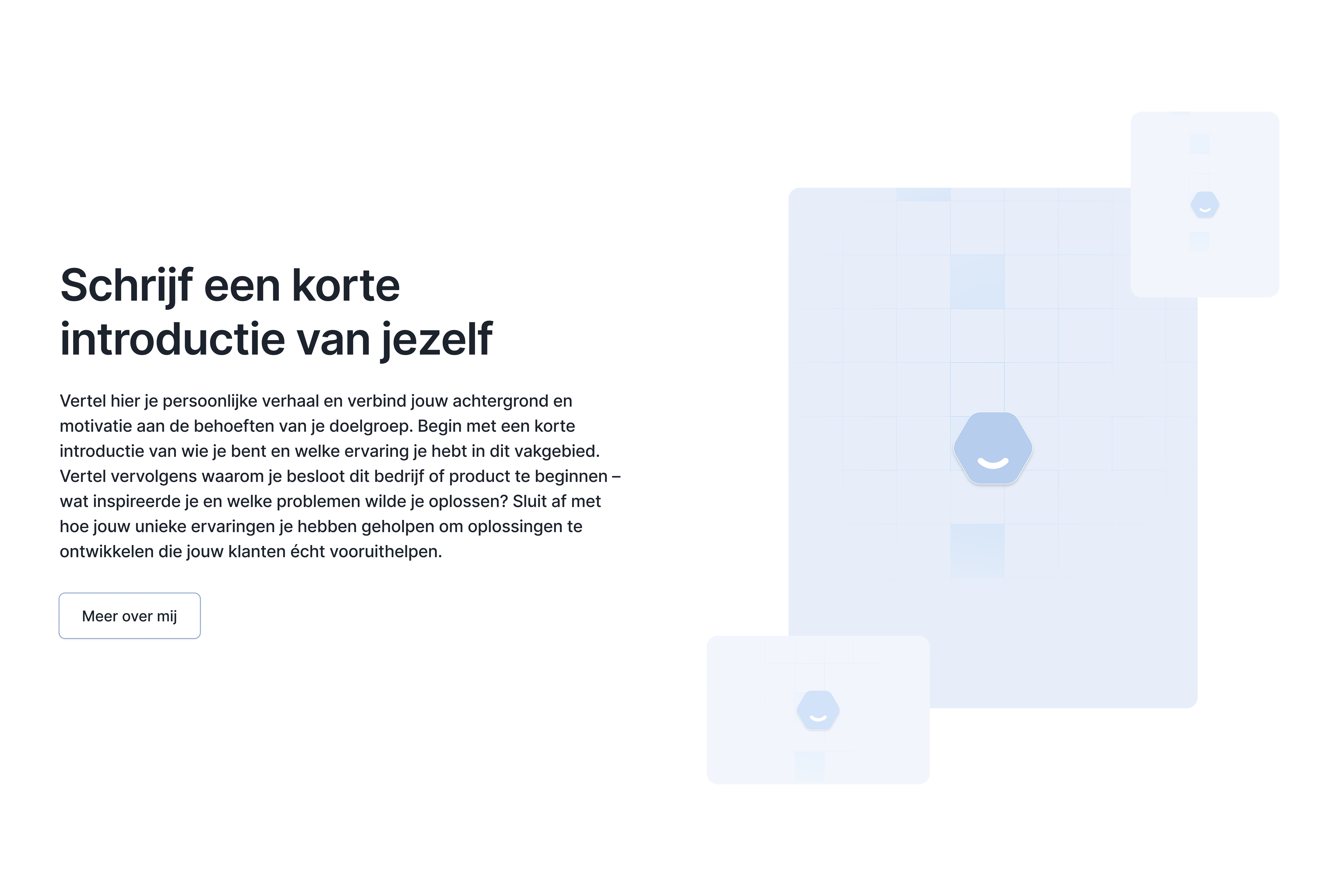 {"type":"@webflow/XscpData","payload":{"nodes":[{"_id":"6a64dbee-f90c-4749-2196-2fc8c9c47383","type":"Block","tag":"header","classes":["4b6241f6-2e31-3bac-16f1-74e591e0b0ca"],"children":["e86bc7d7-0689-a931-78f6-3f9ba7ee1ebf"],"data":{"text":false,"tag":"header","devlink":{"runtimeProps":{},"slot":""},"displayName":"","attr":{"id":""},"xattr":[],"search":{"exclude":false},"visibility":{"conditions":[]}}},{"_id":"e86bc7d7-0689-a931-78f6-3f9ba7ee1ebf","type":"Block","tag":"div","classes":["62366dc3-2432-a5d1-67e0-085e73aa474a"],"children":["8c0c9202-a206-3222-56d0-48c8bd52439b"],"data":{"text":false,"tag":"div","devlink":{"runtimeProps":{},"slot":""},"displayName":"","attr":{"id":""},"xattr":[],"search":{"exclude":false},"visibility":{"conditions":[]}}},{"_id":"8c0c9202-a206-3222-56d0-48c8bd52439b","type":"Block","tag":"div","classes":["b0934d9a-875a-bb42-0630-12090a77fc5b"],"children":["c2e8a230-0490-125d-7b11-9b3acef42b3b"],"data":{"text":false,"tag":"div","devlink":{"runtimeProps":{},"slot":""},"displayName":"","attr":{"id":""},"xattr":[],"search":{"exclude":false},"visibility":{"conditions":[]}}},{"_id":"c2e8a230-0490-125d-7b11-9b3acef42b3b","type":"Block","tag":"div","classes":["47e53913-eb45-d5ea-b09a-1fceda151969"],"children":["d5a5e785-2adf-f182-dc70-8f763a2da919"],"data":{"text":false,"tag":"div","devlink":{"runtimeProps":{},"slot":""},"displayName":"","attr":{"id":""},"xattr":[],"search":{"exclude":false},"visibility":{"conditions":[]}}},{"_id":"d5a5e785-2adf-f182-dc70-8f763a2da919","type":"Block","tag":"div","classes":["4b6241f6-2e31-3bac-16f1-74e591e0b0c7"],"children":["453c7861-fdde-dfdd-43d2-33673f7fc126"],"data":{"text":false,"tag":"div","devlink":{"runtimeProps":{},"slot":""},"displayName":"","attr":{"id":""},"xattr":[],"search":{"exclude":false},"visibility":{"conditions":[]}}},{"_id":"453c7861-fdde-dfdd-43d2-33673f7fc126","type":"Block","tag":"div","classes":["4b6241f6-2e31-3bac-16f1-74e591e0b0cd"],"children":["2bfbfcd6-8436-4a6c-18c5-650c2fcdef8f","21c8cfdf-eb99-570d-62d4-f3056e437ffa"],"data":{"text":false,"tag":"div","devlink":{"runtimeProps":{},"slot":""},"displayName":"","attr":{"id":""},"xattr":[],"search":{"exclude":false},"visibility":{"conditions":[]}}},{"_id":"2bfbfcd6-8436-4a6c-18c5-650c2fcdef8f","type":"Block","tag":"div","classes":["4b6241f6-2e31-3bac-16f1-74e591e0b0cb"],"children":["92cc3893-cec6-eab1-1c47-0bd64c12ba16","3794fc70-fd62-394f-1b9a-888570390b2f","a6e0b374-4b71-25f6-407a-36d79e968cbc"],"data":{"text":false,"tag":"div","devlink":{"runtimeProps":{},"slot":""},"displayName":"","attr":{"id":""},"xattr":[],"search":{"exclude":false},"visibility":{"conditions":[]}}},{"_id":"92cc3893-cec6-eab1-1c47-0bd64c12ba16","type":"Block","tag":"div","classes":["2b7ce42a-68c2-b493-7ffe-3975868fa804","2adac28d-b1cd-2814-fd2f-d06e92612f51"],"children":["c68cc7de-dda0-3bd4-412e-d358881927e3"],"data":{"text":false,"tag":"div","devlink":{"runtimeProps":{},"slot":""},"displayName":"","attr":{"id":""},"xattr":[],"search":{"exclude":false},"visibility":{"conditions":[]}}},{"_id":"c68cc7de-dda0-3bd4-412e-d358881927e3","type":"Heading","tag":"h2","classes":["4b6241f6-2e31-3bac-16f1-74e591e0b0c1"],"children":["ae80f6b2-f9bb-a2a4-287d-ab1f203bdce2"],"data":{"tag":"h2","devlink":{"runtimeProps":{},"slot":""},"displayName":"","attr":{"id":""},"xattr":[],"search":{"exclude":false},"visibility":{"conditions":[]}}},{"_id":"ae80f6b2-f9bb-a2a4-287d-ab1f203bdce2","text":true,"v":"Schrijf een korte introductie van jezelf"},{"_id":"3794fc70-fd62-394f-1b9a-888570390b2f","type":"Paragraph","tag":"p","classes":["d3b87ce9-69ee-da92-9e80-64b3bc2cc5a5"],"children":["bd78708e-c5dd-b8f7-4cd0-f15b1a09cd67"],"data":{"devlink":{"runtimeProps":{},"slot":""},"displayName":"","attr":{"id":""},"xattr":[],"search":{"exclude":false},"visibility":{"conditions":[]}}},{"_id":"bd78708e-c5dd-b8f7-4cd0-f15b1a09cd67","text":true,"v":"Vertel hier je persoonlijke verhaal en verbind jouw achtergrond en motivatie aan de behoeften van je doelgroep. Begin met een korte introductie van wie je bent en welke ervaring je hebt in dit vakgebied. Vertel vervolgens waarom je besloot dit bedrijf of product te beginnen – wat inspireerde je en welke problemen wilde je oplossen? Sluit af met hoe jouw unieke ervaringen je hebben geholpen om oplossingen te ontwikkelen die jouw klanten écht vooruithelpen."},{"_id":"a6e0b374-4b71-25f6-407a-36d79e968cbc","type":"Block","tag":"div","classes":["ce352128-35a6-8b6a-af9d-6543931881a5","2adac28d-b1cd-2814-fd2f-d06e92612f6e"],"children":["a0ec79ca-65f5-f9c5-2475-8f3dc808081e"],"data":{"text":false,"tag":"div","devlink":{"runtimeProps":{},"slot":""},"displayName":"","attr":{"id":""},"xattr":[],"search":{"exclude":false},"visibility":{"conditions":[]}}},{"_id":"a0ec79ca-65f5-f9c5-2475-8f3dc808081e","type":"Block","tag":"div","classes":["7a430290-1e11-fb0a-7a60-f535b0e8c7c4"],"children":["fa44e7c1-571f-5bc3-6c6f-9a188f3a05ad"],"data":{"text":false,"tag":"div","devlink":{"runtimeProps":{},"slot":""},"displayName":"","attr":{"id":""},"xattr":[],"search":{"exclude":false},"visibility":{"conditions":[]}}},{"_id":"fa44e7c1-571f-5bc3-6c6f-9a188f3a05ad","type":"Link","tag":"a","classes":["62366dc3-2432-a5d1-67e0-085e73aa4740","62366dc3-2432-a5d1-67e0-085e73aa4750"],"children":["0d696a52-5067-a5f9-e045-d16250ad82f3"],"data":{"button":true,"block":"","link":{"mode":"external","url":"#"},"eventIds":[],"attr":{"id":""},"devlink":{"runtimeProps":{},"slot":""},"displayName":"","xattr":[],"search":{"exclude":false},"visibility":{"conditions":[]}}},{"_id":"0d696a52-5067-a5f9-e045-d16250ad82f3","text":true,"v":"Meer over mij"},{"_id":"21c8cfdf-eb99-570d-62d4-f3056e437ffa","type":"Block","tag":"div","classes":["4b6241f6-2e31-3bac-16f1-74e591e0b0ce"],"children":["3487a0dd-2ba5-e307-41b4-02ab3d391330","f2323e4a-daed-7191-199c-ed019ea5d41d","dde2e932-43ff-e73b-b9dc-cf6c62bf071d"],"data":{"text":false,"tag":"div","devlink":{"runtimeProps":{},"slot":""},"displayName":"","attr":{"id":""},"xattr":[],"search":{"ex
