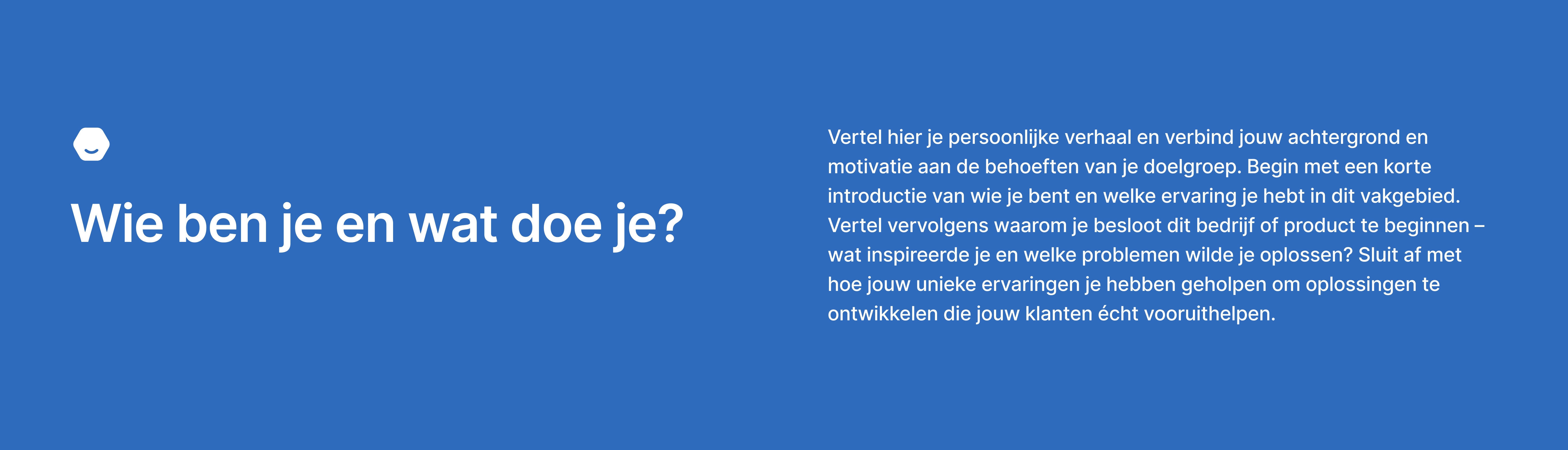 {"type":"@webflow/XscpData","payload":{"nodes":[{"_id":"1dba0b5f-dc5a-4d64-1d57-a0842ffd07d0","type":"Block","tag":"section","classes":["76d3f90c-6452-3161-d0c6-0e836cbd01fc","5c8f2109-c96e-067e-e135-501b195a143f"],"children":["e92216ce-a11d-01bf-9787-77fe64c60c7e","4f1834b6-0097-18ce-b4fd-ab779eeaaa8c"],"data":{"text":false,"tag":"section","devlink":{"runtimeProps":{},"slot":""},"displayName":"","attr":{"id":""},"xattr":[],"search":{"exclude":false},"visibility":{"conditions":[]}}},{"_id":"e92216ce-a11d-01bf-9787-77fe64c60c7e","type":"Block","tag":"div","classes":["62366dc3-2432-a5d1-67e0-085e73aa474a"],"children":["59773182-a527-e207-6ee4-770512eb606a"],"data":{"text":false,"tag":"div","devlink":{"runtimeProps":{},"slot":""},"displayName":"","attr":{"id":""},"xattr":[],"search":{"exclude":false},"visibility":{"conditions":[]}}},{"_id":"59773182-a527-e207-6ee4-770512eb606a","type":"Block","tag":"div","classes":["b0934d9a-875a-bb42-0630-12090a77fc5b"],"children":["36a46a82-4d9f-ab5f-0387-1daf027f0a94"],"data":{"text":false,"tag":"div","devlink":{"runtimeProps":{},"slot":""},"displayName":"","attr":{"id":""},"xattr":[],"search":{"exclude":false},"visibility":{"conditions":[]}}},{"_id":"36a46a82-4d9f-ab5f-0387-1daf027f0a94","type":"Block","tag":"div","classes":["47e53913-eb45-d5ea-b09a-1fceda151969"],"children":["5a645ae4-044b-2c8b-7d27-da648e6eb1c2"],"data":{"text":false,"tag":"div","devlink":{"runtimeProps":{},"slot":""},"displayName":"","attr":{"id":""},"xattr":[],"search":{"exclude":false},"visibility":{"conditions":[]}}},{"_id":"5a645ae4-044b-2c8b-7d27-da648e6eb1c2","type":"Block","tag":"div","classes":["f09e1283-9c72-ed77-2c4d-a5ecc010e97c"],"children":["b699a2e6-aa31-d03e-d57f-0fc2b9afa7d6"],"data":{"text":false,"tag":"div","devlink":{"runtimeProps":{},"slot":""},"displayName":"","attr":{"id":""},"xattr":[],"search":{"exclude":false},"visibility":{"conditions":[]}}},{"_id":"b699a2e6-aa31-d03e-d57f-0fc2b9afa7d6","type":"Grid","tag":"div","classes":["f09e1283-9c72-ed77-2c4d-a5ecc010e97d"],"children":["d4b6ec0d-b2e7-aad0-6264-116cc9665077","f323d4b1-3345-b245-d423-16f433fe2526"],"data":{"devlink":{"runtimeProps":{},"slot":""},"displayName":"","attr":{"id":""},"xattr":[],"search":{"exclude":false},"visibility":{"conditions":[]},"grid":"two-by-two","tag":"div"}},{"_id":"d4b6ec0d-b2e7-aad0-6264-116cc9665077","type":"Block","tag":"div","classes":["f09e1283-9c72-ed77-2c4d-a5ecc010e97e"],"children":["048ba22c-1d6d-1fa5-3dec-c00cec8a081a","40965b84-dd02-59a4-f163-a05d5d3381e5"],"data":{"text":false,"tag":"div","devlink":{"runtimeProps":{},"slot":""},"displayName":"","attr":{"id":""},"xattr":[],"search":{"exclude":false},"visibility":{"conditions":[]}}},{"_id":"048ba22c-1d6d-1fa5-3dec-c00cec8a081a","type":"Block","tag":"div","classes":["2b7ce42a-68c2-b493-7ffe-3975868fa804","2adac28d-b1cd-2814-fd2f-d06e92612f51"],"children":["4421923c-1583-51d4-d37c-7a049bfd288a"],"data":{"text":false,"tag":"div","devlink":{"runtimeProps":{},"slot":""},"displayName":"","attr":{"id":""},"xattr":[],"search":{"exclude":false},"visibility":{"conditions":[]}}},{"_id":"4421923c-1583-51d4-d37c-7a049bfd288a","type":"Block","tag":"div","classes":["f09e1283-9c72-ed77-2c4d-a5ecc010e97f"],"children":["c4076b60-628a-29d7-f232-f8eb9962f746"],"data":{"text":false,"tag":"div","devlink":{"runtimeProps":{},"slot":""},"displayName":"","attr":{"id":""},"xattr":[],"search":{"exclude":false},"visibility":{"conditions":[]}}},{"_id":"c4076b60-628a-29d7-f232-f8eb9962f746","type":"Image","tag":"img","classes":["7a430290-1e11-fb0a-7a60-f535b0e8c7ef"],"children":[],"data":{"img":{"id":"67f6967582484ddf27426a95"},"srcsetDisabled":false,"attr":{"width":"auto","height":"auto","alt":"__wf_reserved_inherit","src":"https://cdn.prod.website-files.com/67f6967582484ddf27426a49/67f6967582484ddf27426a95_icon_white.svg","loading":"lazy","id":""},"sizes":[],"devlink":{"runtimeProps":{},"slot":""},"displayName":"","xattr":[],"search":{"exclude":false},"visibility":{"conditions":[]}}},{"_id":"40965b84-dd02-59a4-f163-a05d5d3381e5","type":"Heading","tag":"h2","classes":["4b6241f6-2e31-3bac-16f1-74e591e0b0c1"],"children":["d067b8b6-0422-7bfb-f2e9-08c5e6ad0c87"],"data":{"tag":"h2","devlink":{"runtimeProps":{},"slot":""},"displayName":"","attr":{"id":""},"xattr":[],"search":{"exclude":false},"visibility":{"conditions":[]}}},{"_id":"d067b8b6-0422-7bfb-f2e9-08c5e6ad0c87","text":true,"v":"Wie ben je en wat doe je?"},{"_id":"f323d4b1-3345-b245-d423-16f433fe2526","type":"Block","tag":"div","classes":["f09e1283-9c72-ed77-2c4d-a5ecc010e980"],"children":["37af1bc2-a74d-8c3f-5a5d-30dc677ca79e"],"data":{"text":false,"tag":"div","devlink":{"runtimeProps":{},"slot":""},"displayName":"","attr":{"id":""},"xattr":[],"search":{"exclude":false},"visibility":{"conditions":[]}}},{"_id":"37af1bc2-a74d-8c3f-5a5d-30dc677ca79e","type":"Paragraph","tag":"p","classes":["d3b87ce9-69ee-da92-9e80-64b3bc2cc5a5"],"children":["f1b0a491-5c41-57d5-7535-782bb3fa069c"],"data":{"devlink":{"runtimeProps":{},"slot":""},"displayName":"","attr":{"id":""},"xattr":[],"search":{"exclude":false},"visibility":{"conditions":[]}}},{"_id":"f1b0a491-5c41-57d5-7535-782bb3fa069c","text":true,"v":"Vertel hier je persoonlijke verhaal en verbind jouw achtergrond en motivatie aan de behoeften van je doelgroep. Begin met een korte introductie van wie je bent en welke ervaring je hebt in dit vakgebied. Vertel vervolgens waarom je besloot dit bedrijf of product te beginnen – wat inspireerde je en welke problemen wilde je oplossen? Sluit af met hoe jouw unieke ervaringen je hebben geholpen om oplossingen te ontwikkelen die jouw klanten écht vooruithelpen."},{"_id":"4f1834b6-0097-18ce-b4fd-ab779eeaaa8c","type":"Block","tag":"div","classes":["f09e1283-9c72-ed77-2c4d-a5ecc010e981"],"children":["bf6862c4-f5b3-e86e-e78d-fb67c8dd6f29","b7016377-7577-1303-f125-3f07362e6a30"],"data":{"text":false,"tag":"div","devlink":{"runtimeProps":{},"slot":""},"displayName":"","attr":{"id":""},"xattr":[],"search":{"exclude":false},"