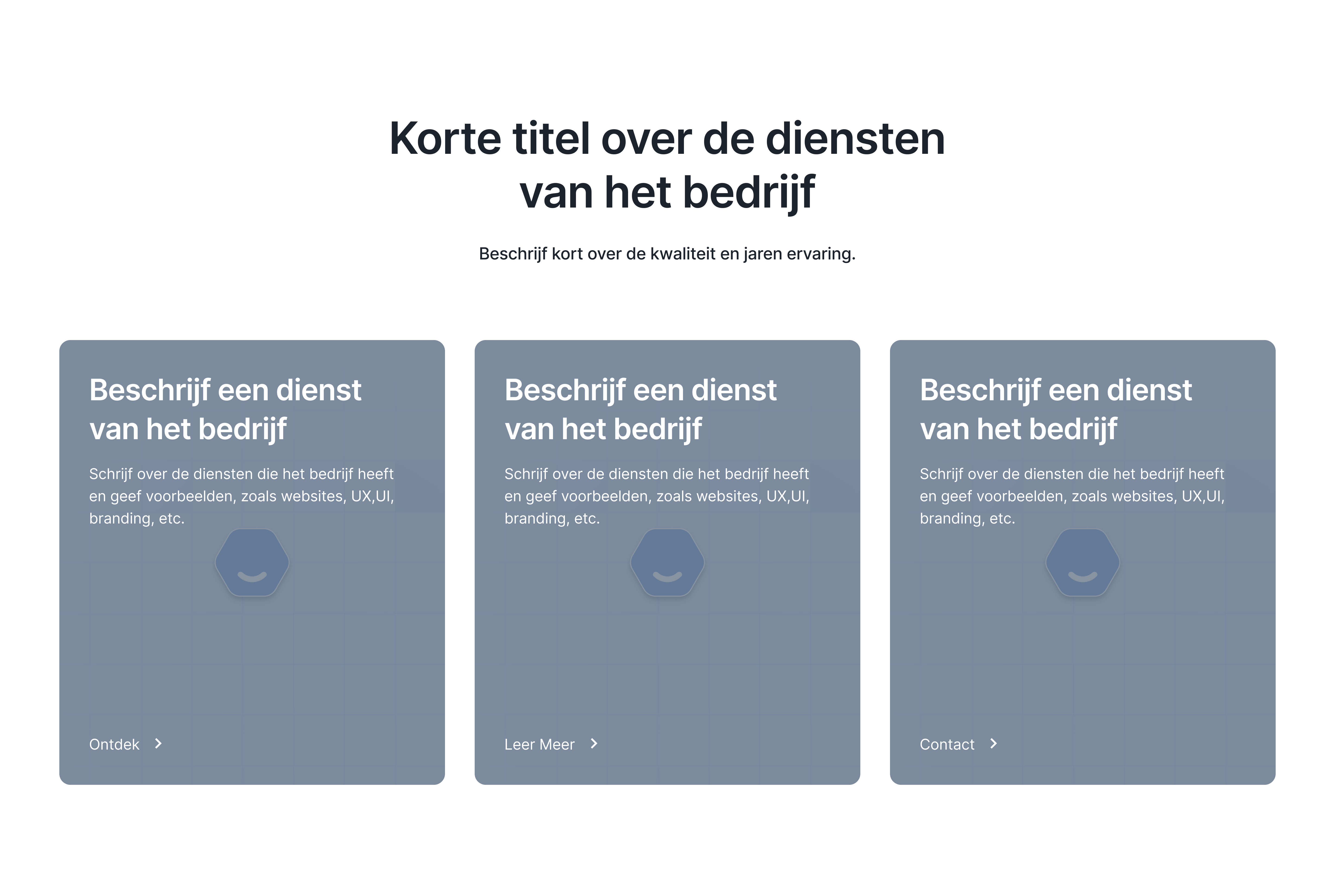 {"type":"@webflow/XscpData","payload":{"nodes":[{"_id":"2890d36d-e732-6557-4131-5cf0d734aa67","type":"Block","tag":"section","classes":["091467c7-2a3d-4f19-e68b-3ae492666ab7"],"children":["5e2981a5-b4b3-9b0d-3657-2c2267518b67"],"data":{"text":false,"tag":"section","devlink":{"runtimeProps":{},"slot":""},"displayName":"","attr":{"id":""},"xattr":[],"search":{"exclude":false},"visibility":{"conditions":[]}}},{"_id":"5e2981a5-b4b3-9b0d-3657-2c2267518b67","type":"Block","tag":"div","classes":["62366dc3-2432-a5d1-67e0-085e73aa474a"],"children":["60064a3d-7ee7-36bc-da16-15eb03bfb131"],"data":{"text":false,"tag":"div","devlink":{"runtimeProps":{},"slot":""},"displayName":"","attr":{"id":""},"xattr":[],"search":{"exclude":false},"visibility":{"conditions":[]}}},{"_id":"60064a3d-7ee7-36bc-da16-15eb03bfb131","type":"Block","tag":"div","classes":["b0934d9a-875a-bb42-0630-12090a77fc5b"],"children":["8e8496d0-d969-9cfd-02b3-cd3a98a48269"],"data":{"text":false,"tag":"div","devlink":{"runtimeProps":{},"slot":""},"displayName":"","attr":{"id":""},"xattr":[],"search":{"exclude":false},"visibility":{"conditions":[]}}},{"_id":"8e8496d0-d969-9cfd-02b3-cd3a98a48269","type":"Block","tag":"div","classes":["47e53913-eb45-d5ea-b09a-1fceda151969"],"children":["f65e187f-9dc3-5af6-6571-5a55c676dc1e"],"data":{"text":false,"tag":"div","devlink":{"runtimeProps":{},"slot":""},"displayName":"","attr":{"id":""},"xattr":[],"search":{"exclude":false},"visibility":{"conditions":[]}}},{"_id":"f65e187f-9dc3-5af6-6571-5a55c676dc1e","type":"Block","tag":"div","classes":["091467c7-2a3d-4f19-e68b-3ae492666ab1"],"children":["1d8e2257-795f-2434-8bd0-177d0dd0a059","9e8a341c-3465-cf0a-d34e-d228fad5328d"],"data":{"text":false,"tag":"div","devlink":{"runtimeProps":{},"slot":""},"displayName":"","attr":{"id":""},"xattr":[],"search":{"exclude":false},"visibility":{"conditions":[]}}},{"_id":"1d8e2257-795f-2434-8bd0-177d0dd0a059","type":"Block","tag":"div","classes":["2b7ce42a-68c2-b493-7ffe-3975868fa804","2adac28d-b1cd-2814-fd2f-d06e92612f40"],"children":["8fbb2f5a-f416-276d-ee27-708890574161"],"data":{"text":false,"tag":"div","devlink":{"runtimeProps":{},"slot":""},"displayName":"","attr":{"id":""},"xattr":[],"search":{"exclude":false},"visibility":{"conditions":[]}}},{"_id":"8fbb2f5a-f416-276d-ee27-708890574161","type":"Block","tag":"div","classes":["7a430290-1e11-fb0a-7a60-f535b0e8c7dd"],"children":["4ab64582-cc1f-3227-f207-202d294af317"],"data":{"text":false,"tag":"div","devlink":{"runtimeProps":{},"slot":""},"displayName":"","attr":{"id":""},"xattr":[],"search":{"exclude":false},"visibility":{"conditions":[]}}},{"_id":"4ab64582-cc1f-3227-f207-202d294af317","type":"Block","tag":"div","classes":["b0934d9a-875a-bb42-0630-12090a77fc7c","f18415ac-4bb0-19d6-57c8-e26dd11fec74"],"children":["9bf38bbd-c017-36c5-fef5-48c2318df846","3b0fc3a6-e09d-ae0c-ce41-c2aa59ed9dd0"],"data":{"text":false,"tag":"div","devlink":{"runtimeProps":{},"slot":""},"displayName":"","attr":{"id":""},"xattr":[],"search":{"exclude":false},"visibility":{"conditions":[]}}},{"_id":"9bf38bbd-c017-36c5-fef5-48c2318df846","type":"Block","tag":"div","classes":["2b7ce42a-68c2-b493-7ffe-3975868fa804","2adac28d-b1cd-2814-fd2f-d06e92612f51"],"children":["c7a0d4c6-8020-d992-3981-727de43fa5d0"],"data":{"text":false,"tag":"div","devlink":{"runtimeProps":{},"slot":""},"displayName":"","attr":{"id":""},"xattr":[],"search":{"exclude":false},"visibility":{"conditions":[]}}},{"_id":"c7a0d4c6-8020-d992-3981-727de43fa5d0","type":"Heading","tag":"h2","classes":["091467c7-2a3d-4f19-e68b-3ae492666ab2"],"children":["2bab9016-051b-4e85-0df9-b3715f30ba66","b2d83728-cf9f-bc74-cbc4-00cf54bd79ec","8ef926fb-452b-d5a3-f479-83332cf4a0a8"],"data":{"tag":"h2","devlink":{"runtimeProps":{},"slot":""},"displayName":"","attr":{"id":""},"xattr":[],"search":{"exclude":false},"visibility":{"conditions":[]}}},{"_id":"2bab9016-051b-4e85-0df9-b3715f30ba66","text":true,"v":"Korte titel over de diensten"},{"_id":"b2d83728-cf9f-bc74-cbc4-00cf54bd79ec","type":"LineBreak","tag":"br","classes":[],"children":[],"data":{"sym":{"inst":"LineBreak"}}},{"_id":"8ef926fb-452b-d5a3-f479-83332cf4a0a8","text":true,"v":"van het bedrijf"},{"_id":"3b0fc3a6-e09d-ae0c-ce41-c2aa59ed9dd0","type":"Paragraph","tag":"p","classes":["d3b87ce9-69ee-da92-9e80-64b3bc2cc5a5"],"children":["5ccfd84f-fce9-450a-199e-1babf7c2fa1b"],"data":{"devlink":{"runtimeProps":{},"slot":""},"displayName":"","attr":{"id":""},"xattr":[],"search":{"exclude":false},"visibility":{"conditions":[]}}},{"_id":"5ccfd84f-fce9-450a-199e-1babf7c2fa1b","text":true,"v":"Beschrijf kort over de kwaliteit en jaren ervaring."},{"_id":"9e8a341c-3465-cf0a-d34e-d228fad5328d","type":"Grid","tag":"div","classes":["091467c7-2a3d-4f19-e68b-3ae492666aaf"],"children":["85672918-5666-eecd-db61-329dcf858196"],"data":{"devlink":{"runtimeProps":{},"slot":""},"displayName":"","attr":{"id":""},"xattr":[],"search":{"exclude":false},"visibility":{"conditions":[]},"grid":"two-by-two","tag":"div"}},{"_id":"85672918-5666-eecd-db61-329dcf858196","type":"Grid","tag":"div","classes":["091467c7-2a3d-4f19-e68b-3ae492666ab3"],"children":["e967008e-29ce-dd07-e502-131cff4c92d7","92e49c8a-70b2-5679-d4c5-66593b1852b0","159945bc-fdac-9eed-b4da-15eda7de18a6"],"data":{"devlink":{"runtimeProps":{},"slot":""},"displayName":"","attr":{"id":""},"xattr":[],"search":{"exclude":false},"visibility":{"conditions":[]},"grid":"two-by-two","style":{"base":{"main":{"noPseudo":{"gridColumnEnd":"span 1","gridColumnStart":"span 1","gridRowEnd":"span 1","gridRowStart":"span 1"}}}},"tag":"div"}},{"_id":"e967008e-29ce-dd07-e502-131cff4c92d7","type":"Block","tag":"div","classes":["091467c7-2a3d-4f19-e68b-3ae492666aad","091467c7-2a3d-4f19-e68b-3ae492666b0f"],"children":["32b57c27-3e7b-8ffd-882d-4b47a1704e6c","2a5ce3ac-8fd5-b533-96aa-7b71b503ccf9"],"data":{"text":false,"tag":"div","devlink":{"runtimeProps":{},"slot":""},"displayName":"","attr":{"id":""},"xattr":[],"search":{"exclude":false},"visibility":{"conditions":[]},"style":{"base