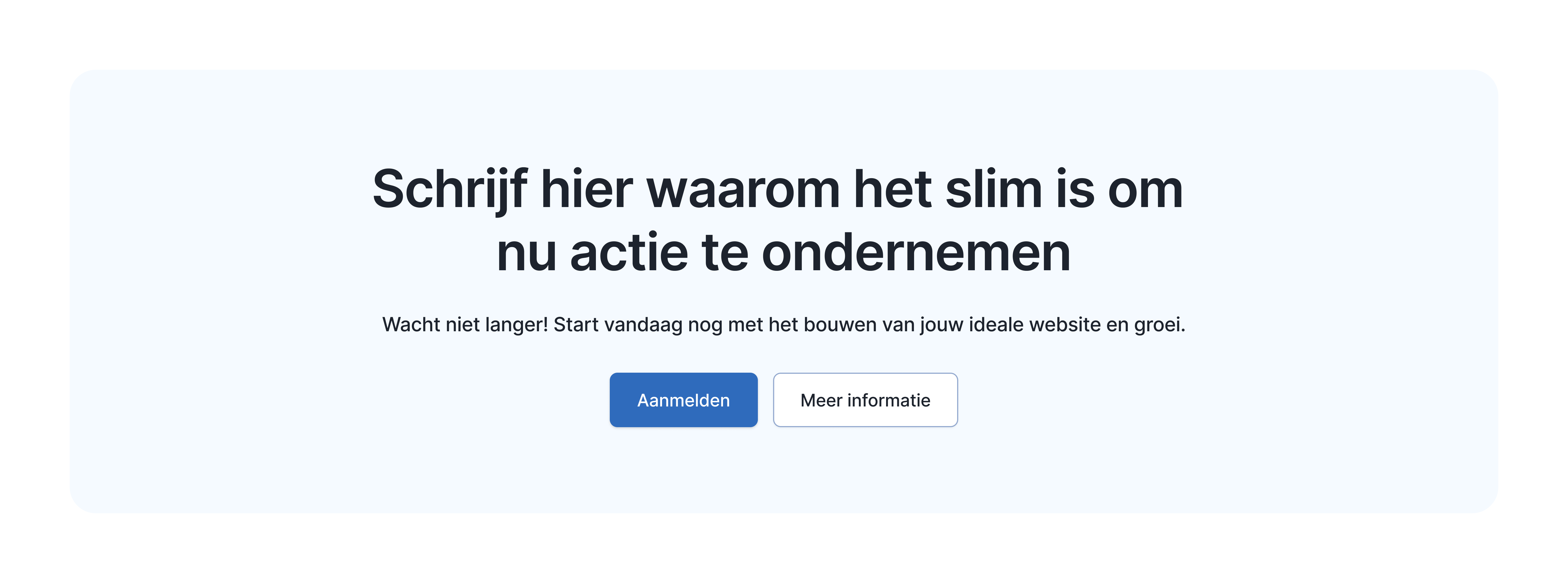 {"type":"@webflow/XscpData","payload":{"nodes":[{"_id":"150f117c-ad44-13c1-346b-039e5d288ad2","type":"Block","tag":"section","classes":["0c330f21-c3f2-046b-3372-7359ec84c813"],"children":["694b1d5d-d33f-3c38-d1d1-9e62f4d2291f"],"data":{"text":false,"tag":"section","devlink":{"runtimeProps":{},"slot":""},"displayName":"","attr":{"id":""},"xattr":[],"search":{"exclude":false},"visibility":{"conditions":[]}}},{"_id":"694b1d5d-d33f-3c38-d1d1-9e62f4d2291f","type":"Block","tag":"div","classes":["62366dc3-2432-a5d1-67e0-085e73aa474a"],"children":["c2c307f4-23b2-2d5e-ae71-9694a85bb8ea"],"data":{"text":false,"tag":"div","devlink":{"runtimeProps":{},"slot":""},"displayName":"","attr":{"id":""},"xattr":[],"search":{"exclude":false},"visibility":{"conditions":[]}}},{"_id":"c2c307f4-23b2-2d5e-ae71-9694a85bb8ea","type":"Block","tag":"div","classes":["b0934d9a-875a-bb42-0630-12090a77fc5b"],"children":["d7f61ce4-615d-3ad1-476e-dd12d26c39ca"],"data":{"text":false,"tag":"div","devlink":{"runtimeProps":{},"slot":""},"displayName":"","attr":{"id":""},"xattr":[],"search":{"exclude":false},"visibility":{"conditions":[]}}},{"_id":"d7f61ce4-615d-3ad1-476e-dd12d26c39ca","type":"Block","tag":"div","classes":["47e53913-eb45-d5ea-b09a-1fceda151969"],"children":["cc7202be-812b-3d28-cc42-1fde198ae2b1"],"data":{"text":false,"tag":"div","devlink":{"runtimeProps":{},"slot":""},"displayName":"","attr":{"id":""},"xattr":[],"search":{"exclude":false},"visibility":{"conditions":[]}}},{"_id":"cc7202be-812b-3d28-cc42-1fde198ae2b1","type":"Block","tag":"div","classes":["0c330f21-c3f2-046b-3372-7359ec84c814"],"children":["9275fd1d-04c2-8f7b-23e3-7094a9968c5c"],"data":{"text":false,"tag":"div","devlink":{"runtimeProps":{},"slot":""},"displayName":"","attr":{"id":""},"xattr":[],"search":{"exclude":false},"visibility":{"conditions":[]}}},{"_id":"9275fd1d-04c2-8f7b-23e3-7094a9968c5c","type":"Block","tag":"div","classes":["7a430290-1e11-fb0a-7a60-f535b0e8c7dd"],"children":["f6804d2c-537c-aad8-8dce-9bad10ad313e"],"data":{"text":false,"tag":"div","devlink":{"runtimeProps":{},"slot":""},"displayName":"","attr":{"id":""},"xattr":[],"search":{"exclude":false},"visibility":{"conditions":[]}}},{"_id":"f6804d2c-537c-aad8-8dce-9bad10ad313e","type":"Block","tag":"div","classes":["b0934d9a-875a-bb42-0630-12090a77fc7c","f18415ac-4bb0-19d6-57c8-e26dd11fec74"],"children":["afd57be2-b331-2d10-5388-d35f704b590f","675994d5-e121-da07-9b41-53f28c1b5604","7554313f-aa74-9d2d-67c1-80a1e2917327"],"data":{"text":false,"tag":"div","devlink":{"runtimeProps":{},"slot":""},"displayName":"","attr":{"id":""},"xattr":[],"search":{"exclude":false},"visibility":{"conditions":[]}}},{"_id":"afd57be2-b331-2d10-5388-d35f704b590f","type":"Block","tag":"div","classes":["2b7ce42a-68c2-b493-7ffe-3975868fa804","2adac28d-b1cd-2814-fd2f-d06e92612f51"],"children":["7a55dc1a-da6f-8459-ec60-7989925c7629"],"data":{"text":false,"tag":"div","devlink":{"runtimeProps":{},"slot":""},"displayName":"","attr":{"id":""},"xattr":[],"search":{"exclude":false},"visibility":{"conditions":[]}}},{"_id":"7a55dc1a-da6f-8459-ec60-7989925c7629","type":"Heading","tag":"h2","classes":["4ea3d07d-e5b8-d576-7011-02f2879aa48e"],"children":["83625a86-942a-83f2-e1dc-843bcb25202a"],"data":{"tag":"h2","devlink":{"runtimeProps":{},"slot":""},"displayName":"","attr":{"id":""},"xattr":[],"search":{"exclude":false},"visibility":{"conditions":[]}}},{"_id":"83625a86-942a-83f2-e1dc-843bcb25202a","text":true,"v":"Schrijf hier waarom het slim is om nu actie te ondernemen"},{"_id":"675994d5-e121-da07-9b41-53f28c1b5604","type":"Paragraph","tag":"p","classes":["d3b87ce9-69ee-da92-9e80-64b3bc2cc5a5"],"children":["f0fe4a43-dbfa-010c-e16c-8a78949ef8e6"],"data":{"devlink":{"runtimeProps":{},"slot":""},"displayName":"","attr":{"id":""},"xattr":[],"search":{"exclude":false},"visibility":{"conditions":[]}}},{"_id":"f0fe4a43-dbfa-010c-e16c-8a78949ef8e6","text":true,"v":"Wacht niet langer! Start vandaag nog met het bouwen van jouw ideale website en groei."},{"_id":"7554313f-aa74-9d2d-67c1-80a1e2917327","type":"Block","tag":"div","classes":["ce352128-35a6-8b6a-af9d-6543931881a5","2adac28d-b1cd-2814-fd2f-d06e92612f6e"],"children":["9e6fd317-aec7-8a0a-8aa3-ca01f96e5d16"],"data":{"text":false,"tag":"div","devlink":{"runtimeProps":{},"slot":""},"displayName":"","attr":{"id":""},"xattr":[],"search":{"exclude":false},"visibility":{"conditions":[]}}},{"_id":"9e6fd317-aec7-8a0a-8aa3-ca01f96e5d16","type":"Block","tag":"div","classes":["7a430290-1e11-fb0a-7a60-f535b0e8c7c4","e78afe50-f704-27db-025e-1c3ee5d0200a"],"children":["9c6e8a18-d7cf-27ad-c6b9-f4e5c80e4d26","c84bab1e-1b16-5b3e-3747-8d2c184355d3"],"data":{"text":false,"tag":"div","devlink":{"runtimeProps":{},"slot":""},"displayName":"","attr":{"id":""},"xattr":[],"search":{"exclude":false},"visibility":{"conditions":[]}}},{"_id":"9c6e8a18-d7cf-27ad-c6b9-f4e5c80e4d26","type":"Link","tag":"a","classes":["62366dc3-2432-a5d1-67e0-085e73aa4740"],"children":["f05c9c1b-0202-d3e7-9548-cecd392ae846"],"data":{"button":true,"block":"","link":{"mode":"external","url":"#"},"eventIds":[],"attr":{"id":""},"devlink":{"runtimeProps":{},"slot":""},"displayName":"","xattr":[],"search":{"exclude":false},"visibility":{"conditions":[]}}},{"_id":"f05c9c1b-0202-d3e7-9548-cecd392ae846","text":true,"v":"Aanmelden"},{"_id":"c84bab1e-1b16-5b3e-3747-8d2c184355d3","type":"Link","tag":"a","classes":["62366dc3-2432-a5d1-67e0-085e73aa4740","62366dc3-2432-a5d1-67e0-085e73aa4750"],"children":["978c7ffd-f18d-b5d3-48b1-6d1e36a7a7ae"],"data":{"button":true,"block":"","link":{"mode":"external","url":"#"},"eventIds":[],"attr":{"id":""},"devlink":{"runtimeProps":{},"slot":""},"displayName":"","xattr":[],"search":{"exclude":false},"visibility":{"conditions":[]}}},{"_id":"978c7ffd-f18d-b5d3-48b1-6d1e36a7a7ae","text":true,"v":"Meer informatie"}],"styles":[{"_id":"2adac28d-b1cd-2814-fd2f-d06e92612f6e","fake":false,"type":"class","name":"margin-medium","namespace":"","comb":"&","styleLess":"margin-right: 0rem; margin-bottom: 0rem