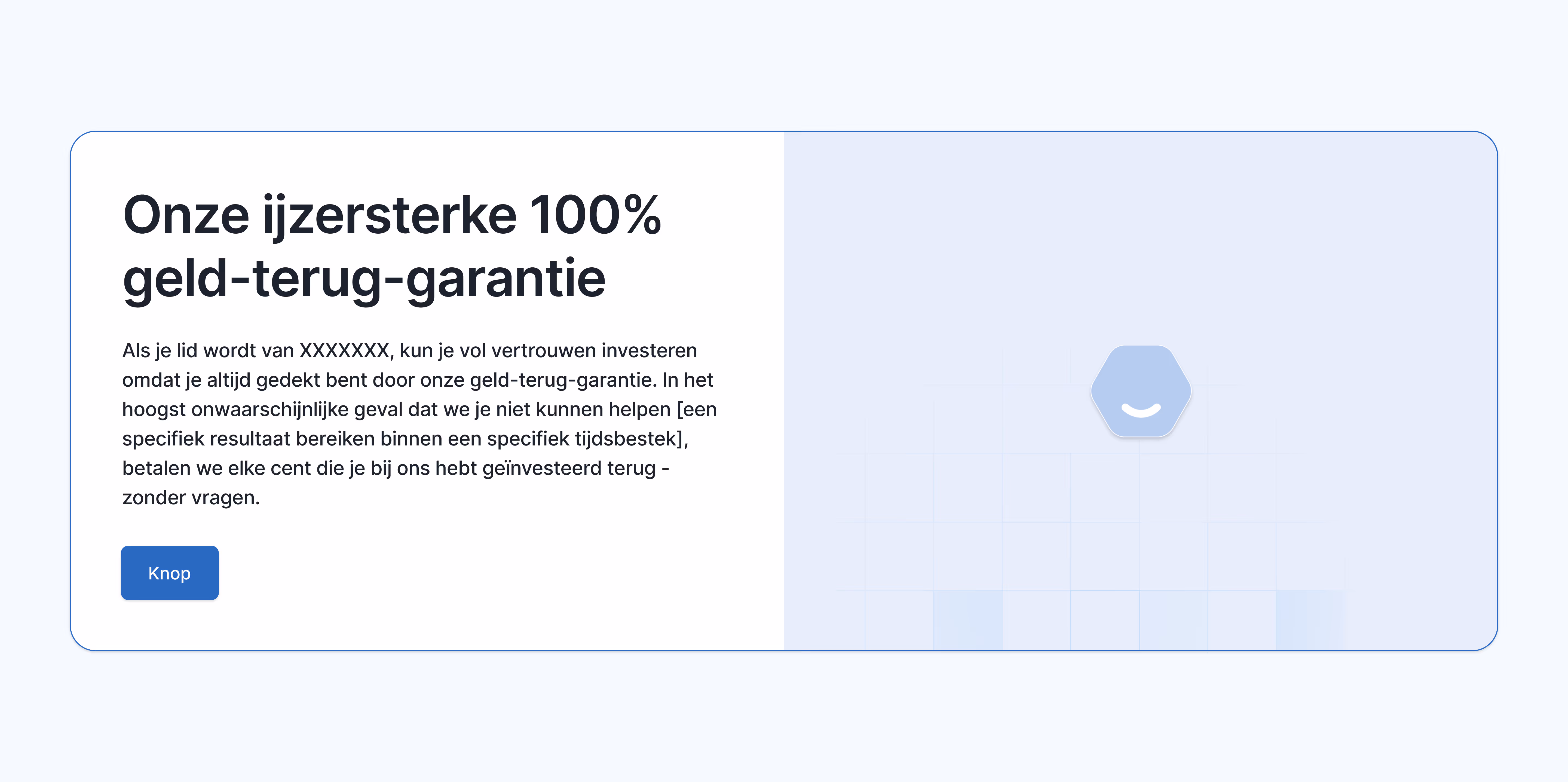 {"type":"@webflow/XscpData","payload":{"nodes":[{"_id":"4588b04d-a5ca-0113-56ea-e05a5310f13b","type":"Block","tag":"section","classes":["819f642d-bf8a-55f4-6196-d524798e7362"],"children":["77f228cb-0025-708e-69d2-3513887336a3"],"data":{"text":false,"tag":"section","devlink":{"runtimeProps":{},"slot":""},"displayName":"","attr":{"id":""},"xattr":[],"search":{"exclude":false},"visibility":{"conditions":[]}}},{"_id":"77f228cb-0025-708e-69d2-3513887336a3","type":"Block","tag":"div","classes":["47e53913-eb45-d5ea-b09a-1fceda151967"],"children":["a991dd2e-bb8a-f005-e123-1f4412a86254"],"data":{"text":false,"tag":"div","devlink":{"runtimeProps":{},"slot":""},"displayName":"","attr":{"id":""},"xattr":[],"search":{"exclude":false},"visibility":{"conditions":[]}}},{"_id":"a991dd2e-bb8a-f005-e123-1f4412a86254","type":"Block","tag":"div","classes":["b0934d9a-875a-bb42-0630-12090a77fc5b"],"children":["268b1342-7d1e-b2f7-3631-b2b27936fef9"],"data":{"text":false,"tag":"div","devlink":{"runtimeProps":{},"slot":""},"displayName":"","attr":{"id":""},"xattr":[],"search":{"exclude":false},"visibility":{"conditions":[]}}},{"_id":"268b1342-7d1e-b2f7-3631-b2b27936fef9","type":"Block","tag":"div","classes":["47e53913-eb45-d5ea-b09a-1fceda151969"],"children":["f7968fd7-c0a9-473e-15e5-8a45a438768b"],"data":{"text":false,"tag":"div","devlink":{"runtimeProps":{},"slot":""},"displayName":"","attr":{"id":""},"xattr":[],"search":{"exclude":false},"visibility":{"conditions":[]}}},{"_id":"f7968fd7-c0a9-473e-15e5-8a45a438768b","type":"Block","tag":"div","classes":["819f642d-bf8a-55f4-6196-d524798e7363"],"children":["073b156c-5011-d677-e607-08753dfcd6ea"],"data":{"text":false,"tag":"div","devlink":{"runtimeProps":{},"slot":""},"displayName":"","attr":{"id":""},"xattr":[],"search":{"exclude":false},"visibility":{"conditions":[]}}},{"_id":"073b156c-5011-d677-e607-08753dfcd6ea","type":"Grid","tag":"div","classes":["819f642d-bf8a-55f4-6196-d524798e7364"],"children":["16a80d3f-c03e-a883-0db6-d4a75462664a","59616818-7049-3a9e-805c-02a4bc4cba9e"],"data":{"devlink":{"runtimeProps":{},"slot":""},"displayName":"","attr":{"id":""},"xattr":[],"search":{"exclude":false},"visibility":{"conditions":[]},"grid":"two-by-two","tag":"div"}},{"_id":"16a80d3f-c03e-a883-0db6-d4a75462664a","type":"Block","tag":"div","classes":["819f642d-bf8a-55f4-6196-d524798e7365"],"children":["44cc19fb-30c5-e7d9-1e2d-740b9a2e3a3a","bc73ec0a-ae28-1dfc-5c9f-de51e1ff3b91"],"data":{"text":false,"tag":"div","devlink":{"runtimeProps":{},"slot":""},"displayName":"","attr":{"id":""},"xattr":[],"search":{"exclude":false},"visibility":{"conditions":[]}}},{"_id":"44cc19fb-30c5-e7d9-1e2d-740b9a2e3a3a","type":"Block","tag":"div","classes":["819f642d-bf8a-55f4-6196-d524798e7366"],"children":["12ee68a3-5e16-24ba-d7ed-88f8b3c745bf","99709378-8882-7277-29a9-f823a701b88b"],"data":{"text":false,"tag":"div","devlink":{"runtimeProps":{},"slot":""},"displayName":"","attr":{"id":""},"xattr":[],"search":{"exclude":false},"visibility":{"conditions":[]}}},{"_id":"12ee68a3-5e16-24ba-d7ed-88f8b3c745bf","type":"Block","tag":"div","classes":["2b7ce42a-68c2-b493-7ffe-3975868fa804","2adac28d-b1cd-2814-fd2f-d06e92612f51"],"children":["5ae6da60-06cc-9eae-233f-d6f113ec40cc"],"data":{"text":false,"tag":"div","devlink":{"runtimeProps":{},"slot":""},"displayName":"","attr":{"id":""},"xattr":[],"search":{"exclude":false},"visibility":{"conditions":[]}}},{"_id":"5ae6da60-06cc-9eae-233f-d6f113ec40cc","type":"Heading","tag":"h2","classes":["15cb959b-07b3-606d-31c7-226557479155"],"children":["5d0ed7bb-2270-56aa-ad9f-d09c5ec59d83"],"data":{"tag":"h2","devlink":{"runtimeProps":{},"slot":""},"displayName":"","attr":{"id":""},"xattr":[],"search":{"exclude":false},"visibility":{"conditions":[]}}},{"_id":"5d0ed7bb-2270-56aa-ad9f-d09c5ec59d83","text":true,"v":"Onze ijzersterke 100% geld-terug-garantie"},{"_id":"99709378-8882-7277-29a9-f823a701b88b","type":"Paragraph","tag":"p","classes":["d3b87ce9-69ee-da92-9e80-64b3bc2cc5a5"],"children":["bf67bb41-4636-4bda-2ebb-4e5e4742e15f"],"data":{"devlink":{"runtimeProps":{},"slot":""},"displayName":"","attr":{"id":""},"xattr":[],"search":{"exclude":false},"visibility":{"conditions":[]}}},{"_id":"bf67bb41-4636-4bda-2ebb-4e5e4742e15f","text":true,"v":"Als je lid wordt van XXXXXXX, kun je vol vertrouwen investeren omdat je altijd gedekt bent door onze geld-terug-garantie. In het hoogst onwaarschijnlijke geval dat we je niet kunnen helpen [een specifiek resultaat bereiken binnen een specifiek tijdsbestek], betalen we elke cent die je bij ons hebt geïnvesteerd terug - zonder vragen."},{"_id":"bc73ec0a-ae28-1dfc-5c9f-de51e1ff3b91","type":"Block","tag":"div","classes":["ce352128-35a6-8b6a-af9d-6543931881a5","2adac28d-b1cd-2814-fd2f-d06e92612f6e"],"children":["23c79f0c-23ae-a9f6-59e1-63167de21a55"],"data":{"text":false,"tag":"div","devlink":{"runtimeProps":{},"slot":""},"displayName":"","attr":{"id":""},"xattr":[],"search":{"exclude":false},"visibility":{"conditions":[]}}},{"_id":"23c79f0c-23ae-a9f6-59e1-63167de21a55","type":"Block","tag":"div","classes":["7a430290-1e11-fb0a-7a60-f535b0e8c7c4"],"children":["3bf251be-c224-568b-2045-a3c06f568793"],"data":{"text":false,"tag":"div","devlink":{"runtimeProps":{},"slot":""},"displayName":"","attr":{"id":""},"xattr":[],"search":{"exclude":false},"visibility":{"conditions":[]}}},{"_id":"3bf251be-c224-568b-2045-a3c06f568793","type":"Link","tag":"a","classes":["7a430290-1e11-fb0a-7a60-f535b0e8c7ab"],"children":["283765d7-328f-8243-2174-0d17bf2860a0"],"data":{"button":true,"block":"","link":{"mode":"external","url":"#"},"eventIds":[],"attr":{"id":""},"devlink":{"runtimeProps":{},"slot":""},"displayName":"","xattr":[],"search":{"exclude":false},"visibility":{"conditions":[]}}},{"_id":"283765d7-328f-8243-2174-0d17bf2860a0","text":true,"v":"Knop"},{"_id":"59616818-7049-3a9e-805c-02a4bc4cba9e","type":"Block","tag":"div","classes":["819f642d-bf8a-55f4-6196-d524798e7367"],"children":["26b11a0f-8fe5-91c4-a99e-c1a9f2fd04bc"],"data":{"text":false,