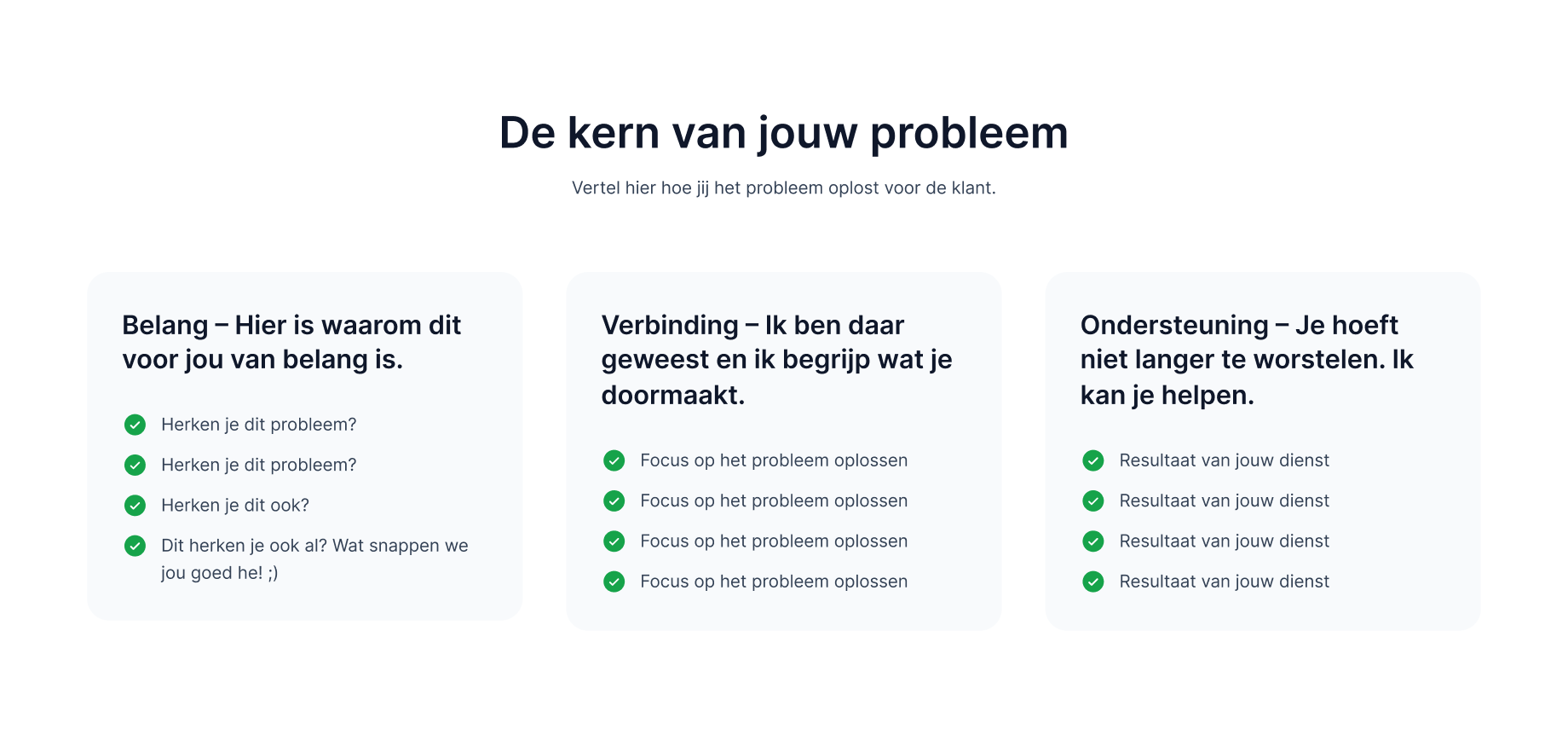 Laat je bezoekers weten dat je hun problemen begrijpt. Beschrijf waarom het probleem belangrijk is en deel je eigen ervaringen. Dit helpt bij het opbouwen van een emotionele band en laat zien dat je oprecht bent in je intenties om te helpen.