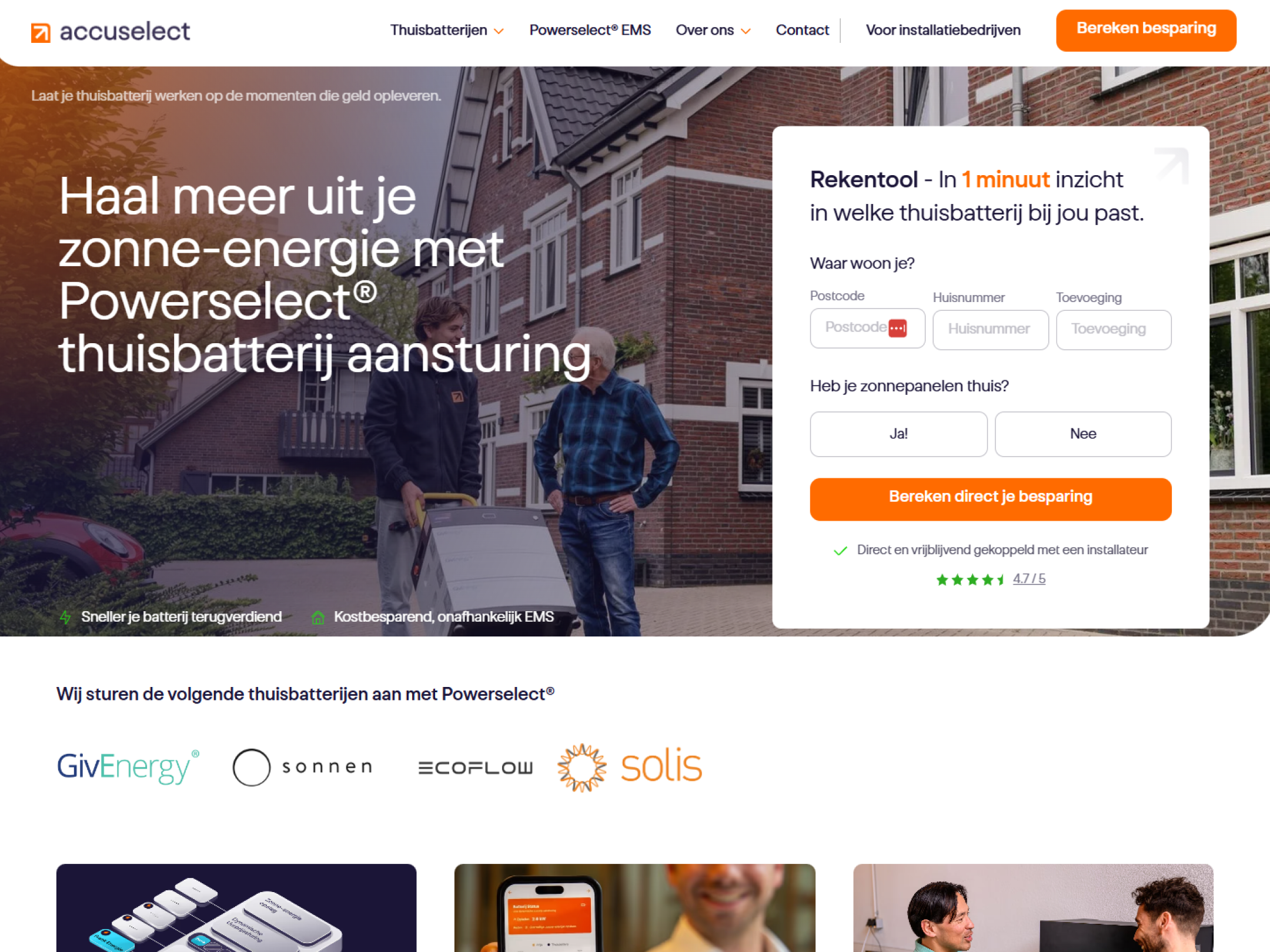 Accuselect is een gespecialiseerde leverancier en installateur van thuisbatterijen en energiemanagement voor particulieren en bedrijven. De website functioneert als slimme marketing- en serviceplatform, gebouwd op WordPress door Studio Flabbergasted, en biedt verhelderende rekenmodellen, uitgebreide referenties en actuele informatie over duurzaam energiemanagement. Met integraties zoals Powerselect® voor cloud-based aansturing en partnerschappen met Europese producenten, zet Accuselect in op innovatie, kwaliteit en maximale klanttevredenheid. Service, transparantie, advisering en nazorg staan hoog aangeschreven en maken Accuselect tot een betrouwbare speler binnen de energietransitie.